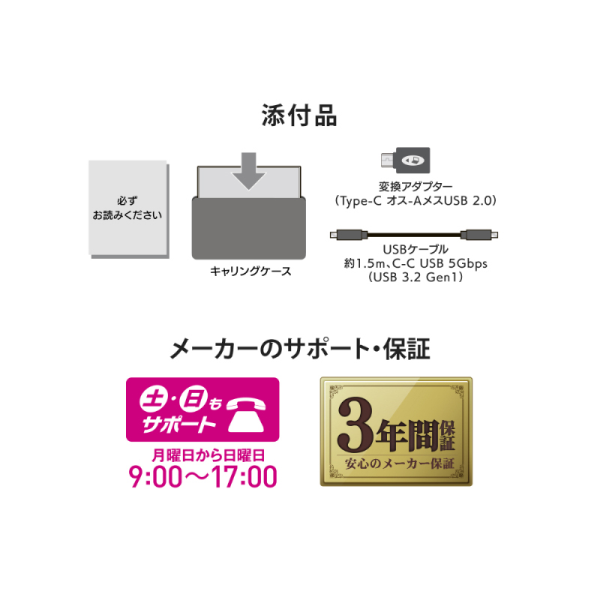 | ケーブル | USBケーブル(約1.5m、C-C USB 5Gbps(USB3.2 Gen1))、変換アダプター(Type-C オス-AメスUSB 2.0)、キャリングケース、必ずお読みください |