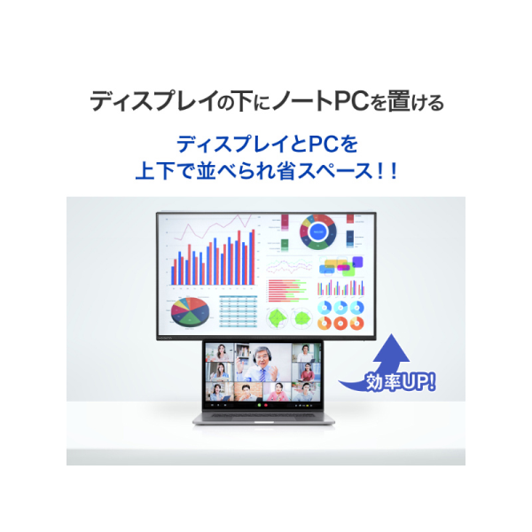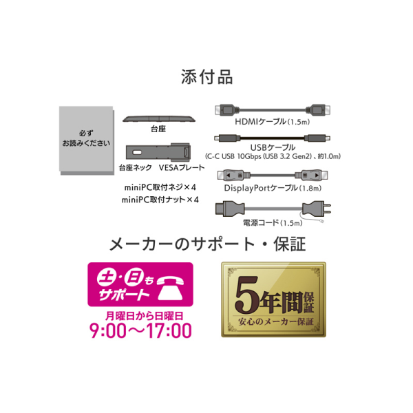 | ケーブル | 電源コード(PSE適合品、約1.5m)、HDMIケーブル(約1.5m)、USBケーブル(C-C USB 10Gbps(USB 3.2 Gen2)、約1.0m)、DisplayPortケーブル(約1.8m)、必ずお読みください、台座ネック、台座、VESAプレート、mini PC取付ネジ×4、mini PC取付ナット×4 |