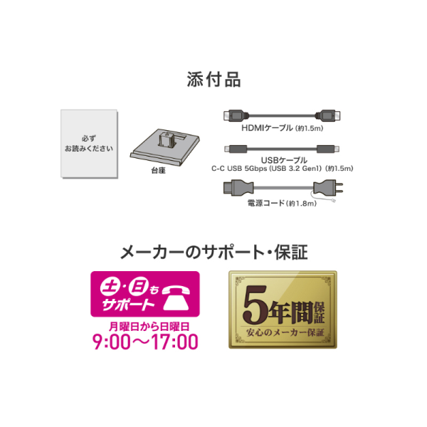| ケーブル | 電源コード(PSE適合品、約1.8m)、HDMIケーブル(約1.5m)、USBケーブル(C-C USB 5Gbps(USB 3.2 Gen1)約1.5m) |