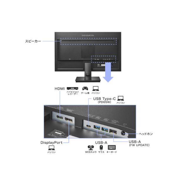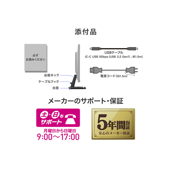 | ケーブル | 電源コード(PSE適合品、約1.5m)、USBケーブル(C-C USB 5Gbps(USB 3.2 Gen1)、約1.5m)、必ずお読みください、台座、台座ネック、ケーブルフック |