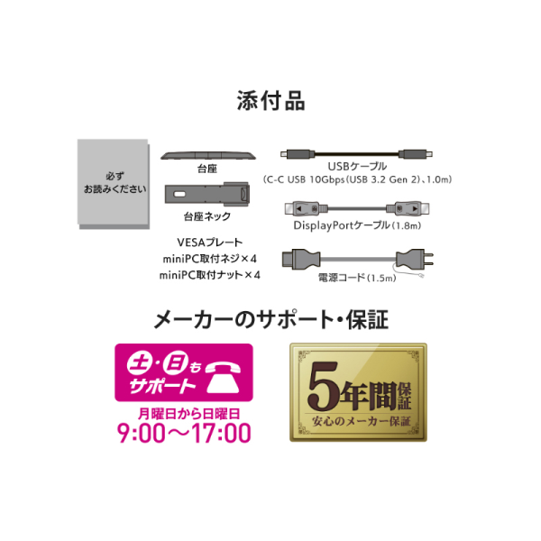 | ケーブル | 電源コード(PSE適合品、1.5m)、USBケーブル(C-C USB 10Gbps (USB 3.2 Gen2)、1.0m)、DisplayPortケーブル(1.8m)、必ずお読みください、台座、台座ネック、VESAプレート、miniPC取付ネジ×4、miniPC取付ナット×4 |