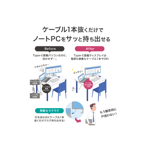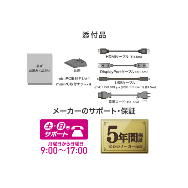 | ケーブル | 電源コード(PSE適合品、約1.5m)、HDMIケーブル(約1.5m)、DisplayPortケーブル(約1.5m)、USBケーブル(C-C USB 5Gbps(USB 3.2 Gen1)、約1.5m)、必ずお読みください、台座、miniPC取付ネジ×4、miniPC取付ナット×4 |