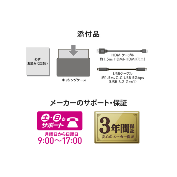 | ケーブル | HDMIケーブル(約1.5m、HDMI-HDMI(ミニ))、USBケーブル(約1.5m、C-C USB 5Gbps(USB3.2 Gen1)) |