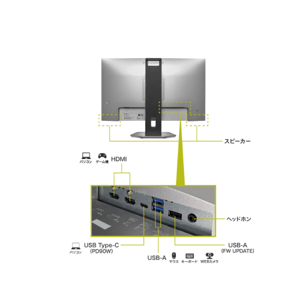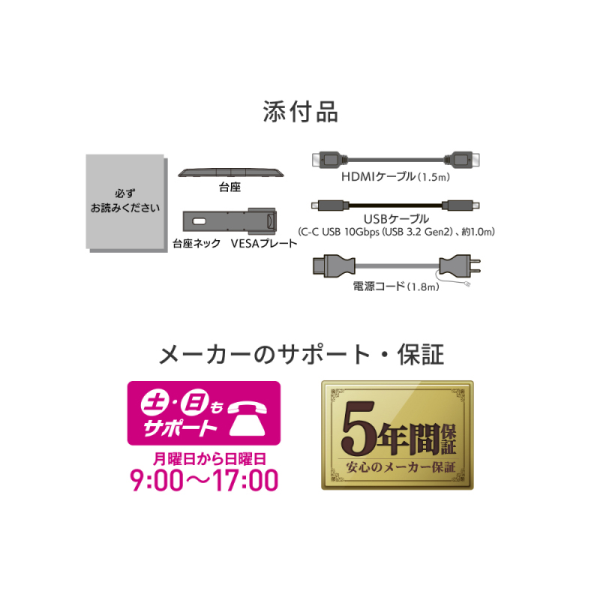 | ケーブル | 電源コード(PSE適合品、約1.8m)、USBケーブル(C-C USB 10Gbps(USB 3.2 Gen2)、約1.0m)、HDMIケーブル(約1.5m)、必ずお読みください、台座、台座ネック、VESAプレート |